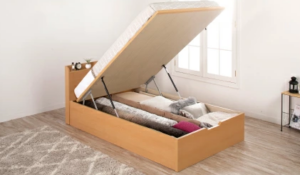 跳ね上げ式は、床板ごと持ち上げて大容量収納を確保するタイプです。引き出しを引くための横スペースが不要なため、ベッド周りの余白が少ない部屋でも採用しやすい利点があります。スーツケースや季節家電、布団など、大きくてかさばる物をまとめて収納しやすいのも特徴です。