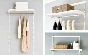 可変式収納は、壁に取り付けた棚柱にブラケットを差し込み、棚板やハンガーポールを自由に組み替えられる仕組みです。
