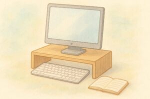 デスク周りでは、木製やMDFのコの字ラックをモニター台として使い、その下にキーボードやノートをしまう使い方が人気です。キャンドゥやワッツの小型ラックを横に並べて、文房具やガジェットを整理する例も多く見られます。