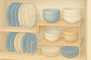 キッチン・食器棚では、ワイヤーラックや木製コの字ラックが活躍します。プレートやボウルを上下に分けて収納することで、一枚一枚が取り出しやすくなり、重ねすぎによる出し入れのストレスが減ります。電子レンジやトースターの上に木製ラックを置き、その上にラップやスパイスをまとめる使い方もよく紹介されています。