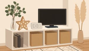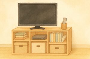 テレビ周辺は小物が集まりやすいため、棚内の区切り方で使い勝手が変わります。レールボードや追加棚板で空間を細かく分けると、レコーダー、ゲーム機、ルーター、コントローラー、配線小物などが収まりやすくなります。配線はケーブルボックスや面ファスナーで束ね、棚の奥に逃がすだけで見た目が整います。
