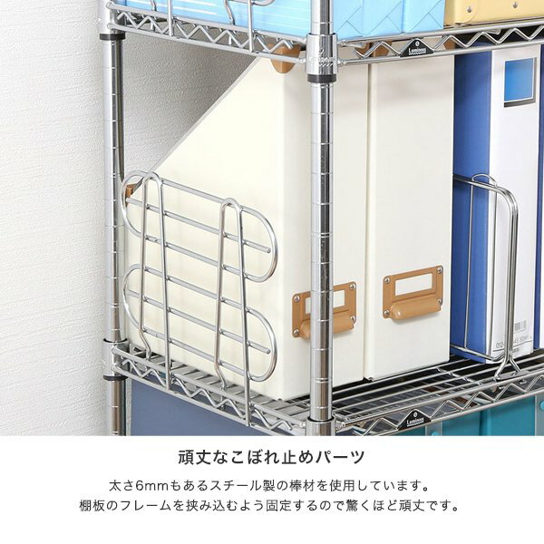 サポート柵は、棚の端からの本の落下を防ぐためのパーツです。特に組み立て済みのラックにも後から簡単に取り付けられる点が大きな利点です。取り付け方は棚のワイヤーに押し込むだけで、工具も不要なため初心者でも扱いやすい構造です。