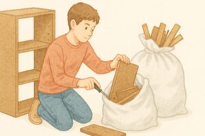 解体後に一般ごみとして出す場合は、素材ごとに袋を分ける必要があります。例えば、板材は可燃ごみ袋に、ネジや金具は不燃ごみ袋に、という形で仕分けします。